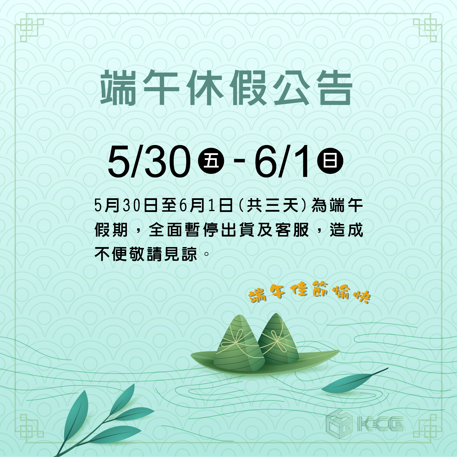 5/30(五)~6/1(日)為端午連假期間